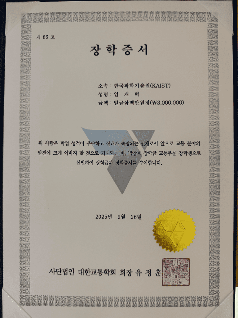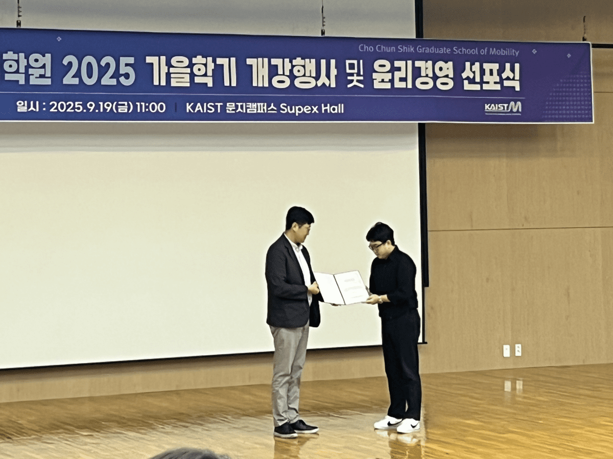 We are thrilled to announce that Chung-kyo Hong , a student from KORAIL in our laboratory, has been honored as the top student for the Spring 2025 semester! In recognition of this remarkable achievement, Hong was awarded the Outstanding Student Award at the Fall 2025 semester opening ceremony.